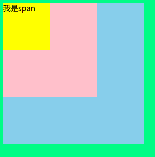 | #box1 { width: 300px; height: 300px; background-color: skyblue; } #box2 { width: 200px; height: 200px; background-color: pink; } #span { display: inline-block; width: 100px; height: 100px; background-color: yellow; } #body { background-color: rgb(0, 252, 134); }