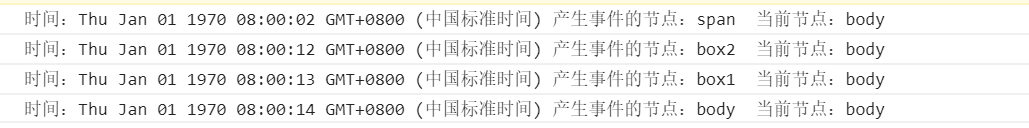 | <script> window.onload = function() { document.getElementById("body").addEventListener("click",eventHandler); } function eventHandler(event) { console.log("时间:"+new Date(event.timeStamp)+" 产生事件的节点:" + event.target.id +" 当前节点:"+event.currentTarget.id); } </script>