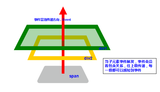 显示我们并不想要这样,我们只想点击哪部分就显示哪部分的提示。那么为什么会这样呢?原因就在于冒泡的机制,当我们点击span时,span会将事件冒泡给div中,然后再冒泡给div外。当冒泡到相应的元素是会触发响应函数,在从内向外的传递过程中,依次打印了各自的信息。