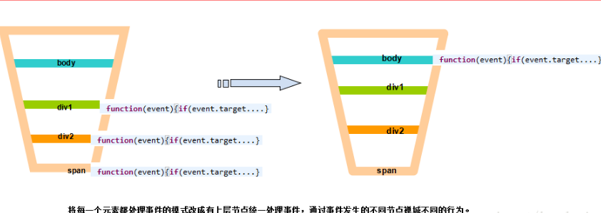 方法二的原理是 元素收到事件后,判断事件是否符合要求,然后做相应的处理,然后事件继续冒泡往上传递;